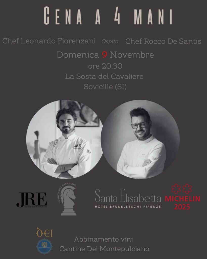La Sosta del Cavaliere si è aggiudicata il premio “Il Forchettiere Awards” come miglior ristorante della Toscana, consolidando la nostra posizione di destinazione di eccellenza per la ristorazione di alta gamma. Lo chef Leonardo Fiorenzani è entrato ufficialmente a far parte dei prestigiosi Jeunes Restaurateurs d’Europe (JRE) nel marzo 2025, unendosi a un’associazione d’élite che riunisce i migliori ristoranti e talenti culinari d’Europa (Membro dell’associazione ambasciatori del gusto dal 2024).